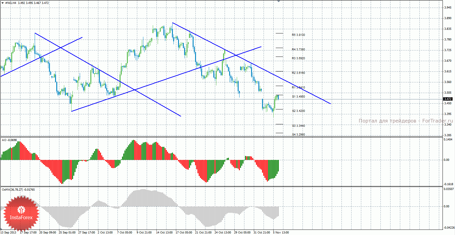 Анализ природного газа за 6 ноября показывает, что цена отработала уровень поддержки 3,4200 и отскочила от него, начав восходящее коррекционное движение. На данный момент актуально нисходящее движение с целями уровни поддержки S2 — 3,4200 и S3 – 3,3440, если цена отскочит от уровня 3,4950. Целями для возможного продолжения витка коррекционного движения выступают уровни 3,5410 и 3,6160, если цена отскочит от уровня 3,4950. Восходящая линия тренда больше не актуальна, так как цена преодолела ее, построена нисходящая линия тренда, которая поддерживает сейчас торгующих на понижение. Индикатор Awesome показывает локальное восходящее движение, последний закрытый бар окрашен в зеленый цвет. OsMA также развернулся наверх, что сигнализирует о восходящем движении цены на газ и в более долгосрочной перспективе. Отскок цены от уровня 3,4950 может спровоцировать завершение коррекции.