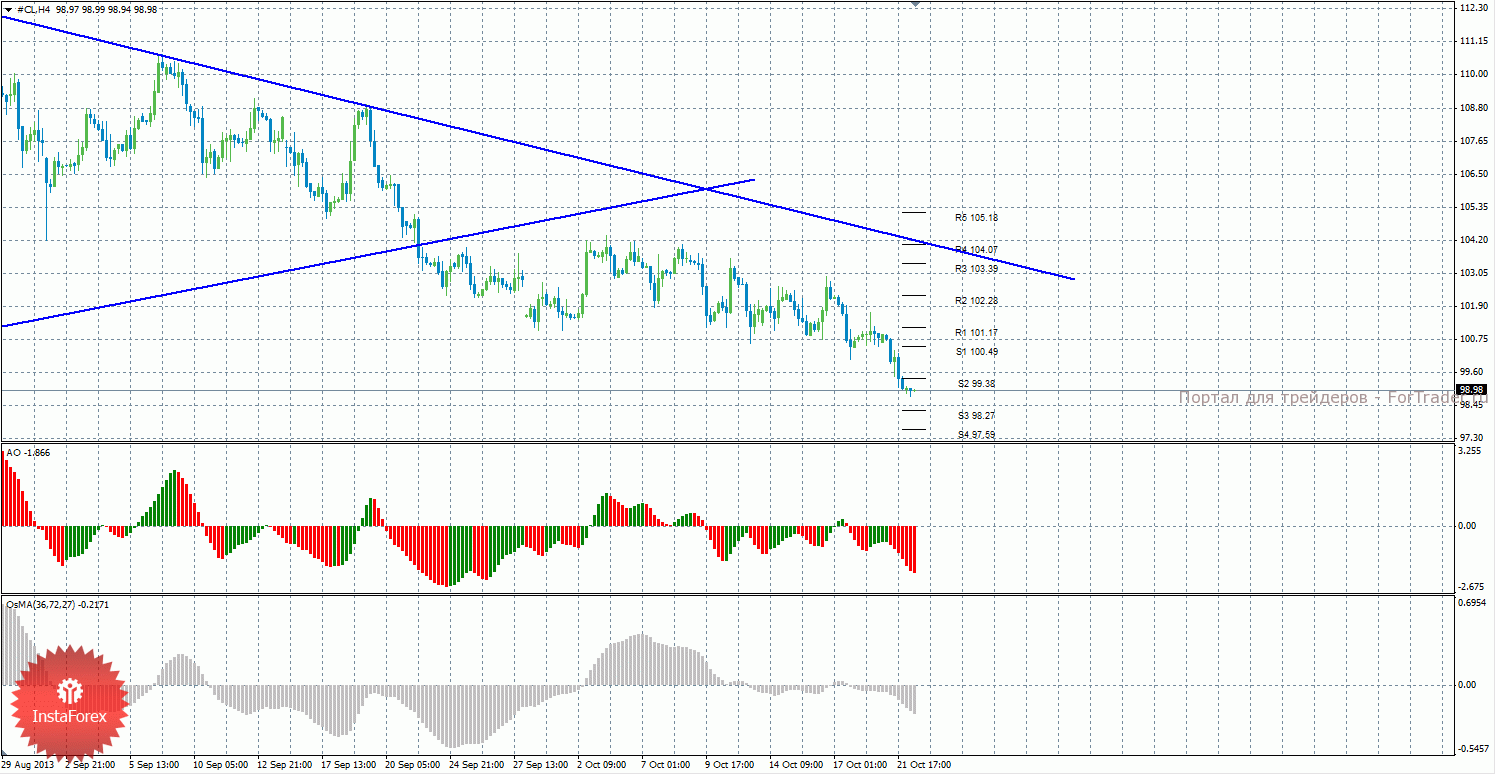 Анализ сырой нефти за 22 октября показывает, что цена продолжает нисходящее движение и преодолела уровни поддержки S1 и S2, оба индикатора направлены вниз. Нисходящее движение может продолжиться с целями S3 – 98,27 и S4 – 97,59, если цена останется ниже уровня 99,38. Может начаться новая восходящая коррекция с целями 100,49 и 101,17, в случае, если цена закрепится выше уровня 99,38. Нисходящая линия тренда сейчас является актуальной и оказывает поддержку торгующим на понижение. Индикатор Awesome показывает текущее нисходящее движение, так как последний закрытый бар красного цвета. OsMA также направлен вниз, что говорит о нисходящем характере движения и в более долгосрочном плане. Закрепление цены выше уровня 99,38 может спровоцировать новый виток восходящей коррекции.