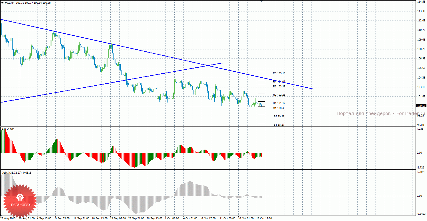 Анализ сырой нефти за 21 октября показывает, что цена возобновила нисходящее движение, но на новой неделе находится между уровнями R1 и S1. Нисходящее движение может продолжиться с целями S2 – 99,38 и S3 – 98,27, если цена закрепится ниже уровня 100,49. Может возобновиться восходящая коррекция с целями 102,28 и 103,39, в случае, если цена закрепится выше уровня 101,17. Нисходящая линия тренда сейчас является актуальной и оказывает поддержку торгующим на понижение. Индикатор Awesome показывает текущее восходящее движение, так как последний закрытый бар зеленого цвета. OsMA же направлен вниз, что говорит о нисходящем характере движения в более долгосрочном плане. Закрепление цены ниже уровня 100,49 может спровоцировать продолжение нисходящего тренда.