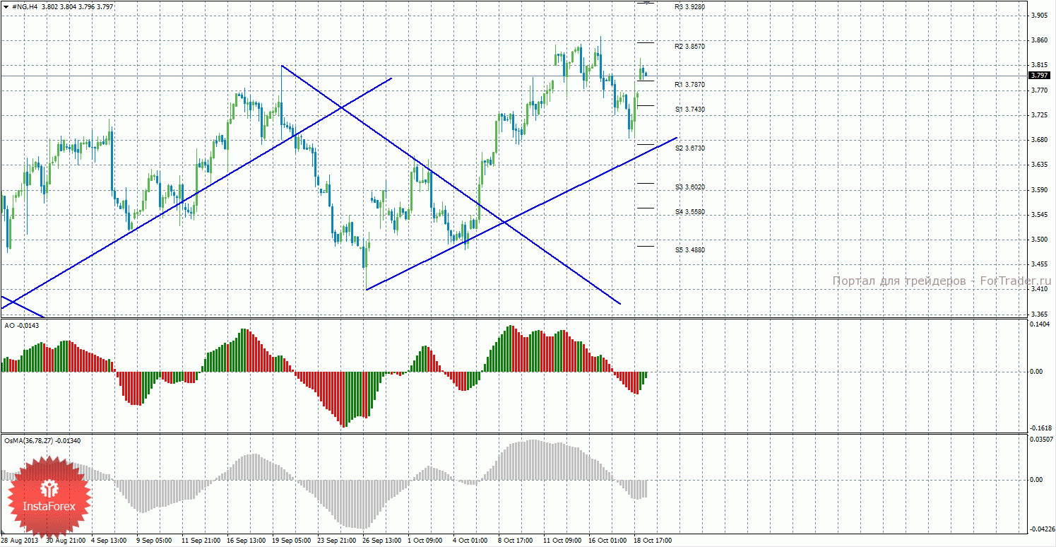 Анализ природного газа за 21 октября показывает, что цена возобновила восходящее движение и преодолела уровень сопротивления R1, оба индикатора также развернулись наверх. На данный момент актуально восходящее движение с целями уровни сопротивления R2 — 3,8570 и R3 – 3,9280, если цена останется выше уровня 3,7870. Целью для возможного возобновления нисходящей коррекции выступают уровни 3,7430 и 3,6730, если цена закрепится ниже уровня 3,7870. Восходящая линия тренда поддерживает на данный момент торгующих на повышение. Индикатор Awesome показывает локальное восходящее движение, последний закрытый бар окрашен в зеленый цвет. OsMA также направлен вверх, что сигнализирует о восходящем движении цены на газ и в более долгосрочной перспективе. Закрепление ниже уровня 3,7870 может спровоцировать возобновление коррекционного движения.