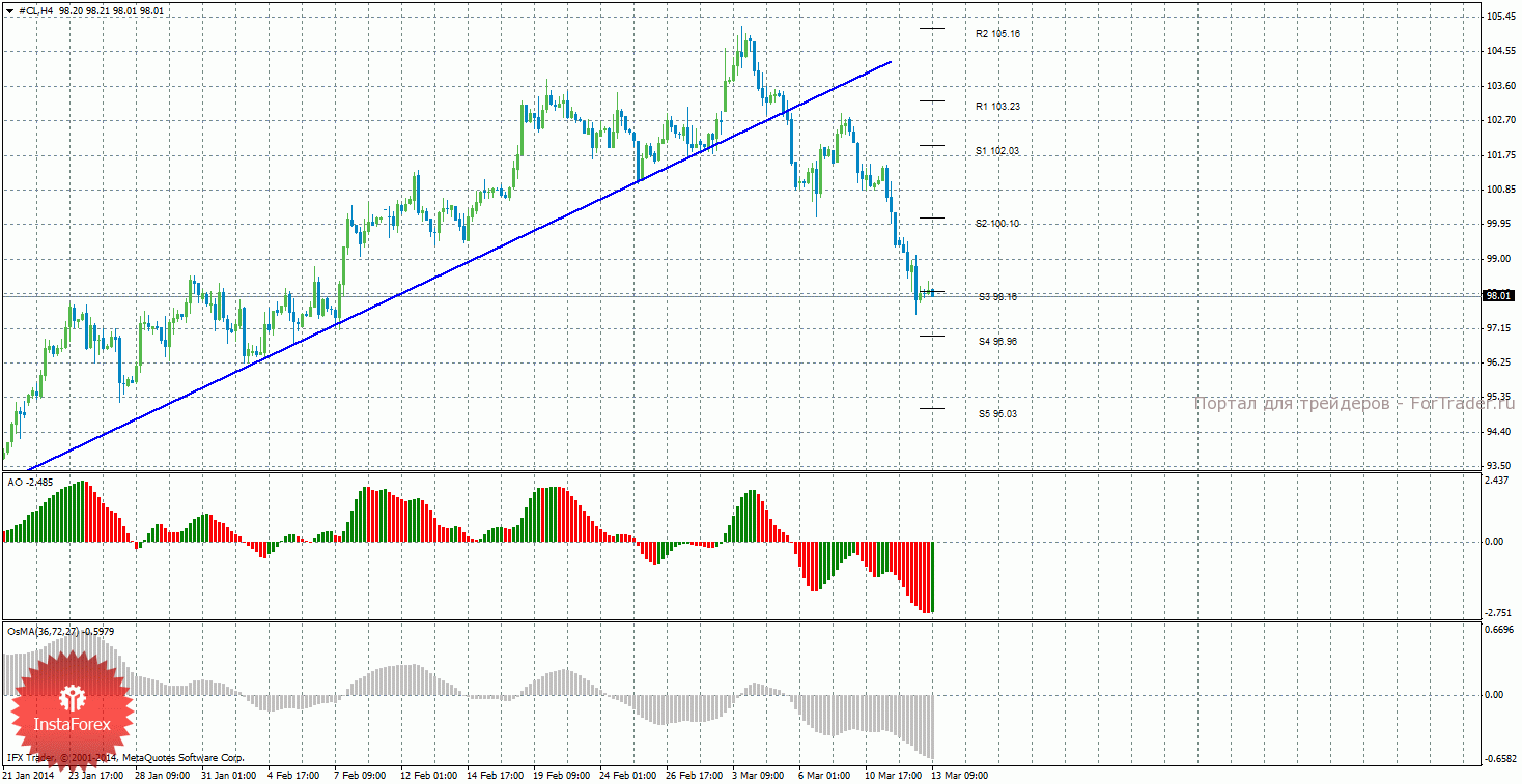 Анализ сырой нефти за 13 марта показывает, что цена продолжает нисходящее движение и отработала уровень поддержки 98,16, который пока не преодолела. Нисходящее движение может продолжиться с целями S4 – 96,96 и S5 – 95,03, если цена закрепится ниже уровня 98,16. Может начаться восходящая коррекция с целями 100,10 и 102,03, в случае, если цена отскочит от уровня 98,16. Восходящая линия тренда больше не оказывает поддержку торгующим на повышение, цена располагается ниже нее, поэтому сейчас стали актуальными короткие позиции. Индикатор Awesome показывает текущее нисходящее движение, так как последний закрытый бар красного цвета. OsMA также направлен вниз, что говорит о нисходящем характере движения и в более долгосрочном плане. Отскок от уровня 98,16 может спровоцировать виток восходящей коррекции.