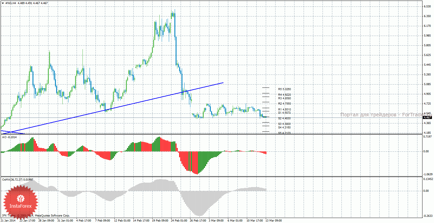 Анализ природного газа за 13 марта показывает, что цена вроде бы возобновила нисходящее движение, однако, сильным это движение назвать никак нельзя. На данный момент актуально нисходящее движение с целями уровни поддержки S3 – 4,3800 и S4 – 4,3160, если цена закрепится ниже уровня 4,4830. Целями для возможной восходящей коррекции выступают уровни сопротивления 4,5870 и 4,6510, если цена отскочит от уровня 4,4830. Цена закрепилась ниже восходящей линии тренда, поэтому она более не актуальна, тенденция на рынке поменялась на нисходящую. Нисходящей линии тренда пока что нет. Индикатор Awesome показывает локальное нисходящее движение, последний закрытый бар окрашен в красный цвет. OsMA также развернулся вниз, что сигнализирует о нисходящем движении цены на газ и в более долгосрочной перспективе. Сейчас на рынке продолжается боковое движение.