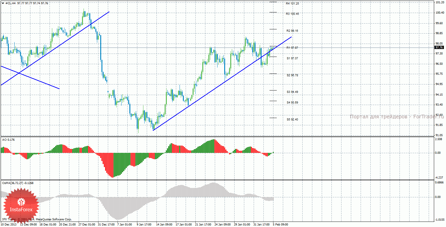 Анализ сырой нефти за 5 февраля показывает, что цена закрепилась ниже восходящей линии тренда, поэтому сейчас актуально нисходящее движение и короткие позиции. Нисходящее движение может продолжиться с целями S1 – 97,07 и S2 – 95,78, если цена отскочит от уровня 97,87. Может продолжиться восходящая коррекция с целями 99,16 и 100,45, в случае, если цена закрепится выше уровня 97,87. Восходящая линия тренда больше не оказывает поддержку торгующим на повышение, цена закрепилась ниже нее, а тенденция на рынке поменялась на нисходящую. Индикатор Awesome показывает текущее восходящее движение, так как последний закрытый бар зеленого цвета. OsMA также развернулся наверх, что говорит о восходящем характере движения и в более долгосрочном плане. Если цена отскочит от уровня 97,87, это может засвидетельствовать возобновление нисходящего движения.