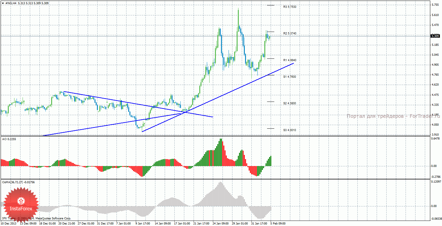 Анализ природного газа за 5 февраля показывает, что цена возобновила восходящее движение и отработала уровень сопротивления 5,3740, который пока что не преодолен. На данный момент актуально восходящее движение с целями уровни сопротивления R3 — 5,7530 и R4 – 5,9870, если цена закрепится выше уровня 5,3740. Целями для возможного начала нисходящей коррекции выступают уровни поддержки 4,9940 и 4,7600, если цена отскочит от уровня 5,3740. Восходящая линия тренда оказывает поддержку торгующим на повышение, цена пока что находится выше нее. Индикатор Awesome показывает локальное восходящее движение, последний закрытый бар окрашен в зеленый цвет. OsMA также направлен наверх, что сигнализирует о восходящем движении цены на газ и в более долгосрочной перспективе. Отскок цены от уровня 5,3740 может спровоцировать виток коррекционного движения.