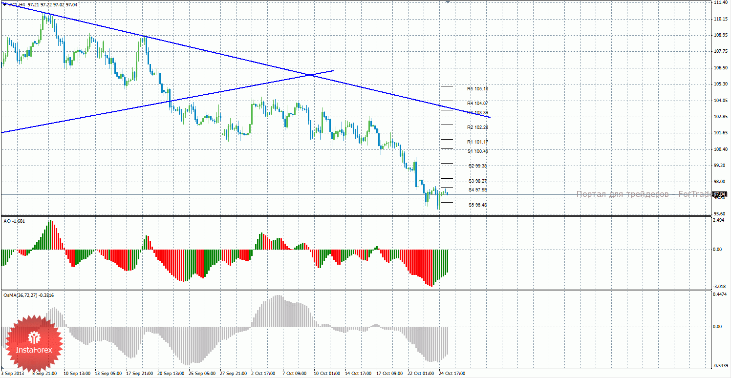 Анализ сырой нефти за 25 октября показывает, что цена не смогла преодолеть последний уровень поддержки, отскочила от него и начала виток восходящей коррекции. Нисходящее движение может возобновиться с целью S5 – 96,48, если цена отскочит от уровня 97,59. Может продолжиться восходящая коррекция с целями 98,27 и 99,38, в случае, если цена закрепится выше уровня 97,59. Нисходящая линия тренда сейчас является актуальной и оказывает поддержку торгующим на понижение. Индикатор Awesome показывает текущее восходящее движение, так как последний закрытый бар зеленого цвета. OsMA также направлен наверх, что говорит о восходящем характере движения и в более долгосрочном плане. Закрепление цены выше уровня 97,59 может усилить коррекционное движение.