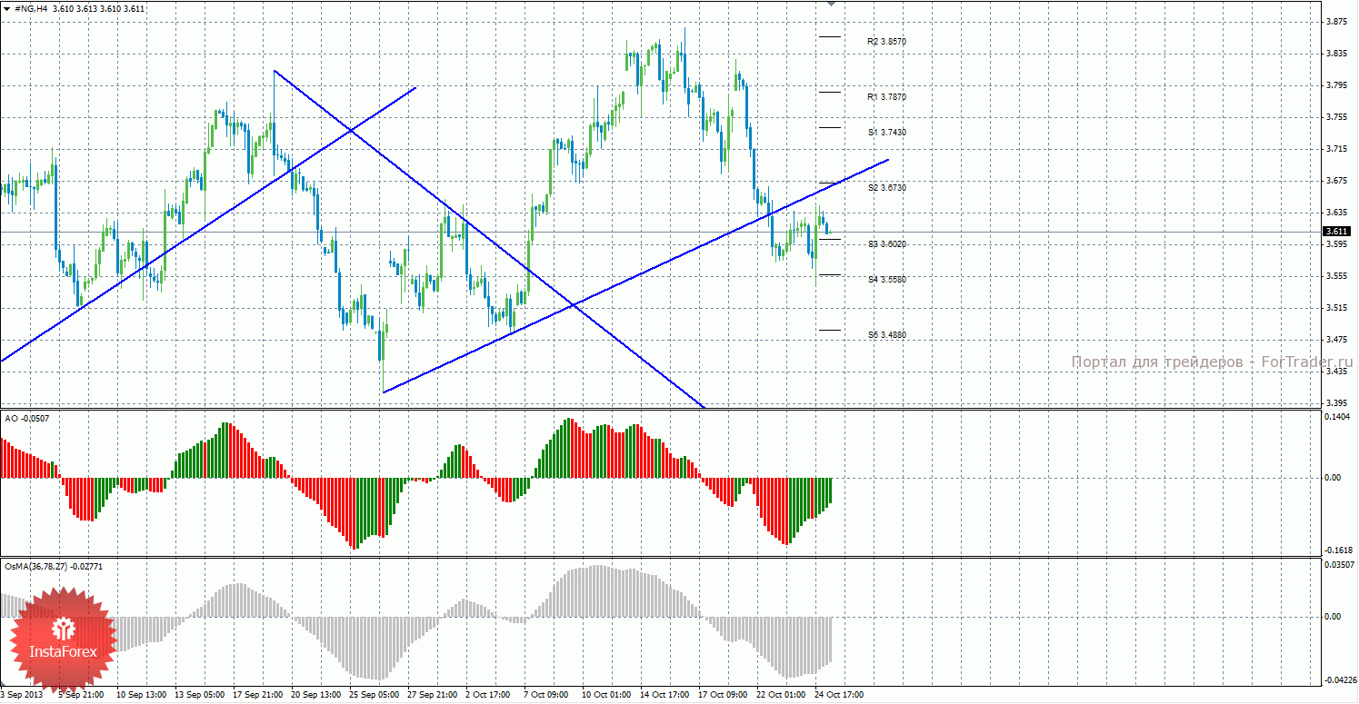 Анализ природного газа за 25 октября показывает, что цена продолжает не очень сильную коррекцию, оба индикатора сигнализируют о коррекционном движении. На данный момент актуально нисходящее движение с целями уровни поддержки S4 — 3,5580 и S5 – 3,4880, если цена закрепится ниже уровня 3,6020. Целью для возможного продолжения восходящей коррекции выступают уровни 3,6730 и 3,7430, если цена останется выше уровня 3,6020. Восходящая линия тренда больше не актуальна, так как цена преодолела ее. Индикатор Awesome показывает локальное восходящее движение, последний закрытый бар окрашен в зеленый цвет. OsMA также направлен вверх, что сигнализирует о восходящем движении цены на газ и в более долгосрочной перспективе. Закрепление ниже уровня 3,6020 может спровоцировать возобновление нисходящего движения.