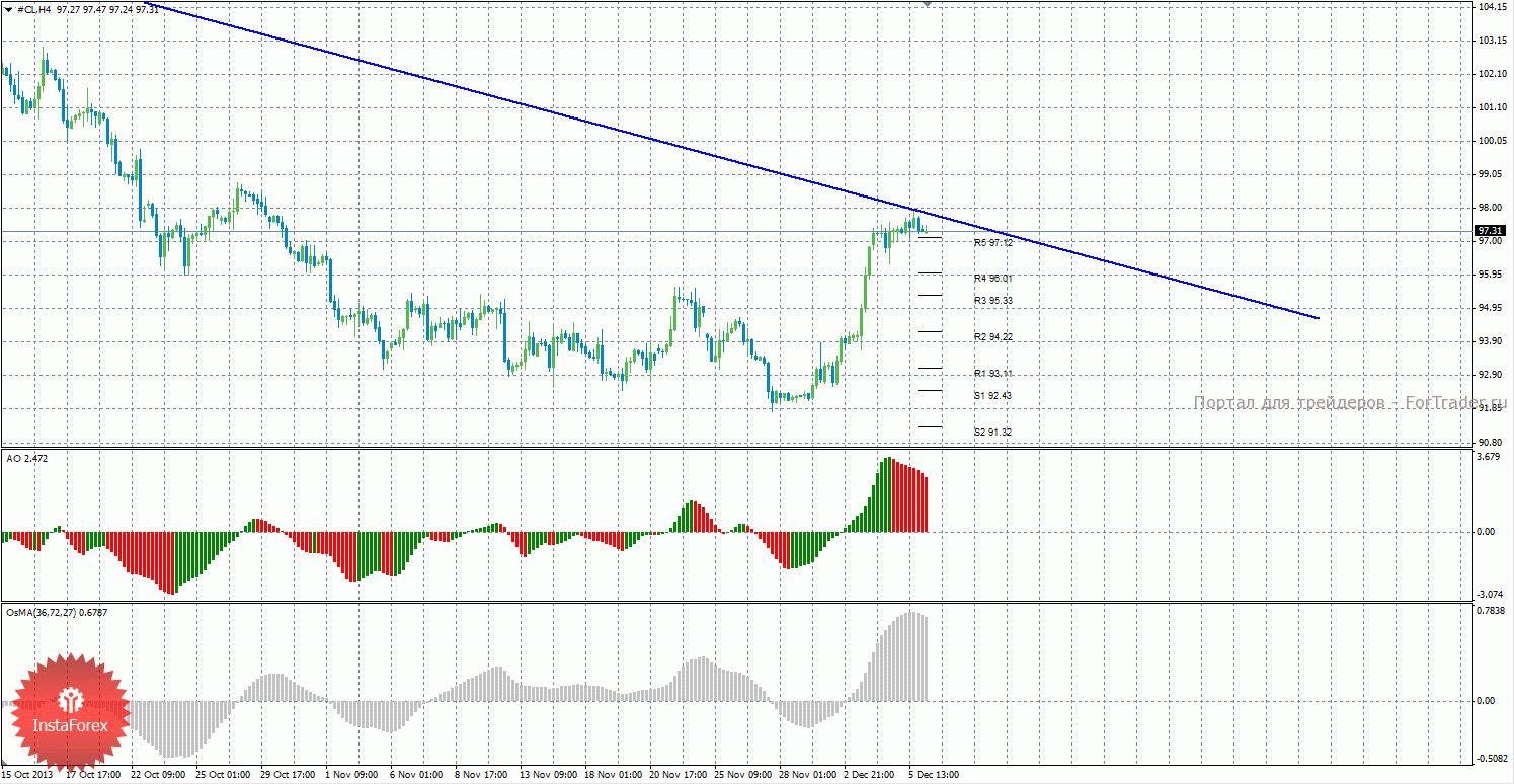 Анализ сырой нефти за 6 декабря показывает, что цена продолжает сильное коррекционное движение и располагается выше последнего уровня сопротивления 97,12. Нисходящее движение может возобновиться с целями R4– 96,01 и R3 – 95,33, если цена закрепится ниже уровня 97,12. Может продолжиться восходящая коррекция с целью нисходящая линия тренда, в случае, если цена останется выше уровня 97,12. Нисходящая линия тренда сейчас является актуальной и оказывает поддержку торгующим на понижение, но, если цена закрепится выше нее, то тенденция на рынке поменяется на восходящую и станут актуальными длинные позиции. Индикатор Awesome показывает текущее нисходящее движение, так как последний закрытый бар красного цвета. OsMA также развернулся вниз, что говорит о нисходящем характере движения и в более долгосрочном плане. Оба индикатора сейчас разряжаются. Отскок цены от линии тренда может спровоцировать завершение восходящей коррекции.