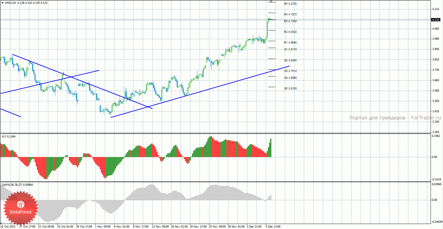 Анализ природного газа за 6 декабря показывает, что цена резко возобновила восходящее движение и преодолела уровень сопротивления R3 – 4,1350. На данный момент актуально восходящее движение с целями уровни сопротивления R4 — 4,1870 и R5 – 4,2700, если цена останется выше уровня 4,1350. Целями для возможного начала нисходящей коррекции выступают уровни поддержки 4,0520 и 3,9690, если цена закрепится ниже уровня 4,1350. Восходящая линия тренда оказывает поддержку торгующим на повышение, ниже нее цена закрепиться пока не смогла. Индикатор Awesome показывает локальное восходящее движение, последний закрытый бар окрашен в зеленый цвет. OsMA также направлен вверх, что сигнализирует о восходящем движении цены на газ и в более долгосрочной перспективе. Закрепление ниже уровня 4,1350 может спровоцировать виток нисходящей коррекции.