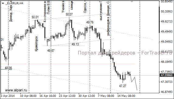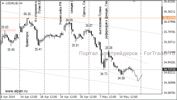 Нисходящие движения по доллару от 36,09 и по евро от 49,76 не завершены. Сегодня курс доллар/рубль и евро/рубль либо останутся торговаться в боковом тренде, либо пойдут ниже к целевым уровням на 34,45 и 47 рублей.