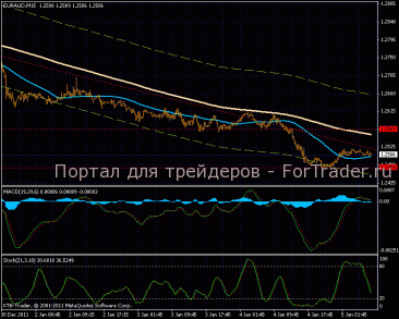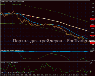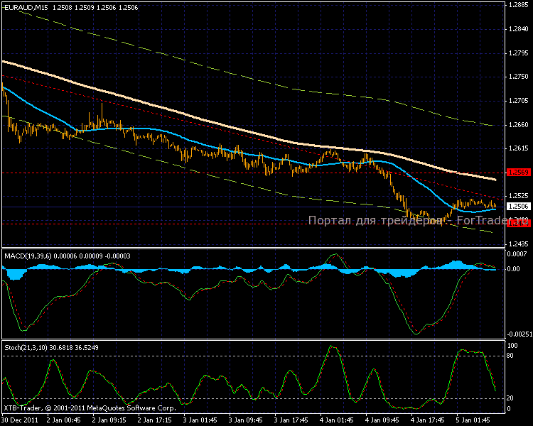 На часовом графике нисходящая тенденция, цена актива покинула нижнюю границу 1,5 процентного канала, более быстрая МА подошла к ней вплотную. Сила продаж постоянно растет, цена валютной пары уже не доходит к своей линии тренда. Индикатор MACD далеко в отрицательной зоне, ближайший уровень поддержки на отметке 1,2470.