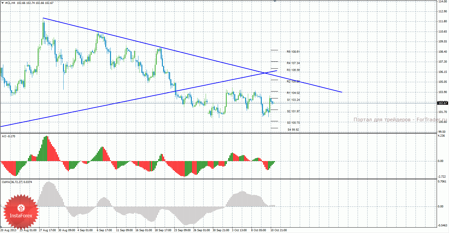 Анализ сырой нефти за 11 октября показывает, что цена скорректировалась к уровню 103,24 и не смогла закрепиться выше него, поэтому может возобновиться нисходящий тренд. Нисходящее движение может продолжиться с целями S2 – 101,97 и S3 – 100,70, если цена останется ниже уровня 103,24. Может также возобновиться восходящая коррекция с целями 104,02 и 105,20, в случае, если цена закрепится выше уровня 103,24. Долгосрочная восходящая линия тренда больше не оказывает поддержку восходящему движению, цена закрепилась ниже нее, а тенденция на рынке поменялась на нисходящую. Построена нисходящая линия тренда, которая сейчас является актуальной и оказывает поддержку торгующим на понижение. Индикатор Awesome показывает текущее восходящее движение, так как последний закрытый бар зеленого цвета. OsMA также направлен вверх, что говорит о восходящем характере движения и в более долгосрочном плане. Отскок от уровня 103,24 мог спровоцировать возобновление нисходящего движения.