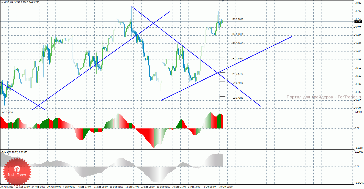 Анализ природного газа за 11 октября показывает, что цена отработала последний целевой уровень и не может пока что его преодолеть, что указывает на возможное начало коррекции. На данный момент актуально восходящее движение с целью уровень сопротивления R5 — 3,7660. Целями для возможного начала нисходящей коррекции выступают уровни 3,7010 и 3,6610, если цена отскочит от уровня 3,7660. Построена новая восходящая линия тренда, которая сейчас поддерживает торгующих на повышение. Индикатор Awesome показывает локальное нисходящее движение, последний закрытый бар окрашен в красный цвет. OsMA также направлен вниз, что сигнализирует о нисходящем движении цены на газ и в более долгосрочной перспективе. Отскок от уровня 3,7660 может спровоцировать новый виток коррекции. Оба индикатора начали разряжаться.