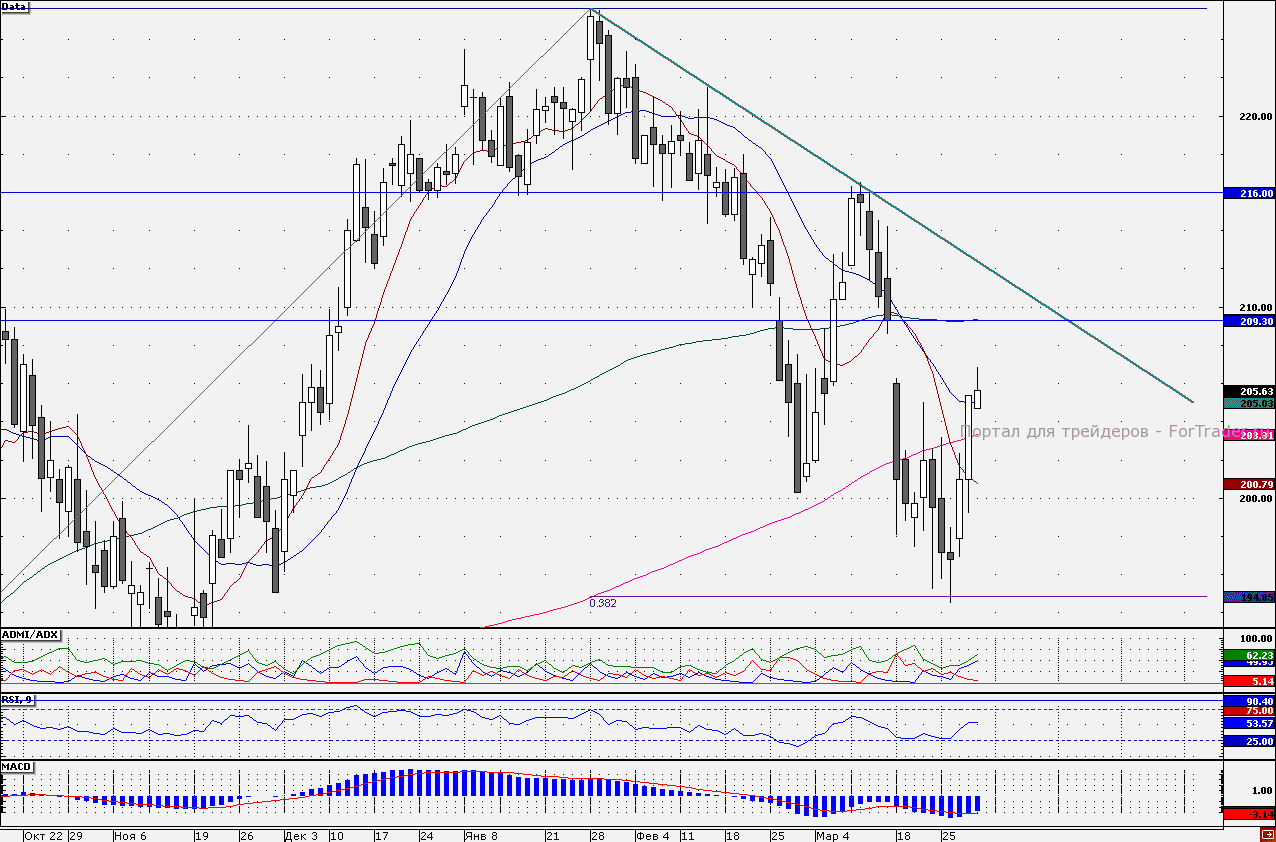 Неплохую динамику сегодня демонстрируют обыкновенные акции «Татнефти». Инвесторы продолжают отыгрывать оглашенную накануне позитивную отчетность по РСБУ за 2012 год. «Быки» получили неплохую возможность закрепиться выше 21-дневной скользящей средней (205,03 руб.). Кроме того, тянуть вверх котировки может незакрытый гэп от 18 марта на отметке 209,3 руб. Показания технических индикаторов не исключают вероятности продолжения позитивной динамики акций, в частности, индикатор ADMI/ADX показывает, что преимущество пока на стороне покупателей (линия «быков» находится выше линии «медведей»). Таким образом, спекулятивные длинные позиции по бумагам стоит удерживать с целью закрытия гэп на отметке 209,3 руб. Наш 30-минутный торговый робот находится в «лонгах», удерживая длинные позиции от отметки 199,01 руб.