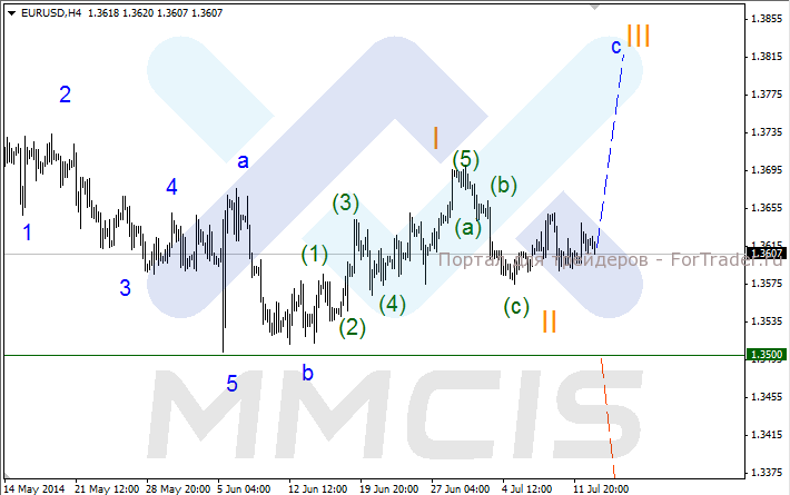 В качестве основного сценария рассматривается продолжение роста в волне «с» и третьей волне к отметке 1.3750, что может дать начало более крупному восходящему тренду. Альтернативный сценарий предполагает пробой уровня поддержки 1.3500, после чего нисходящий тренд может возобновиться.