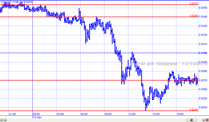 Воспользовавшись укреплением европейских валют, вырасти по отношению к доллару смог и швейцарский франк. Пара доллар/франк с самого начала торговых суток в пятницу начала падение. В его рамках цены преодолели поддержку на 0,9340, 0,9300 и протестировали 0,9240. Минимум был отмечен на 0,9236, от которого к завершению дня пара откатилась к уровню 0,9270.