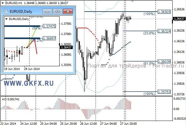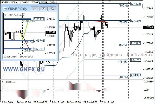 Пара GBPUSD торговалась разнонаправлено и пара находится в поисках повода для дальнейшего роста. В пятницу выходили данные по уточнению ВВП Великобритании за первый квартал, которые немного навредили роста пары, так как были пересмотрены в худшую сторону. Однако пара сумела выйти на уровни выше 1,7000 и держится на этих уровнях. Область 1,6975-1,7000 по-прежнему будет ключевой для дальнейшего принятия решения на этой неделе. На эту неделю традиционно рассматриваю два варианта возможного движения цены, основной красный и альтернативный зеленый. Значимые уровни на сегодня отмечены на часовом графике. Индикатор АО находится в положительной зоне и снижается, указывая на коррекцию перед возможным продолжением роста. Индикатор тренда указывает на рост. Вне рынка.