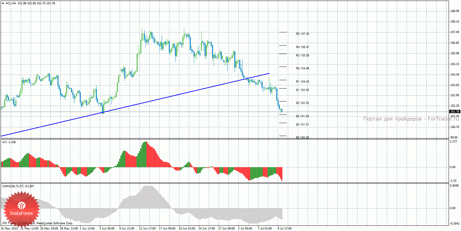 В ходе проведенного анализа движения цены на нефть, можно сделать вывод, что сейчас можно рассматривать ордера на продажу с целями 101,59 и 101,01. Стоп лосс выставляем выше ближайшего уровня сопротивления. При заходе сделки в прибыльность в безубыток. Если цена отскочит от уровня 101,59, это может засвидетельствовать начало коррекции, как и разворот наверх Awesome или OsMA. Длинные позиции сейчас не актуальны.