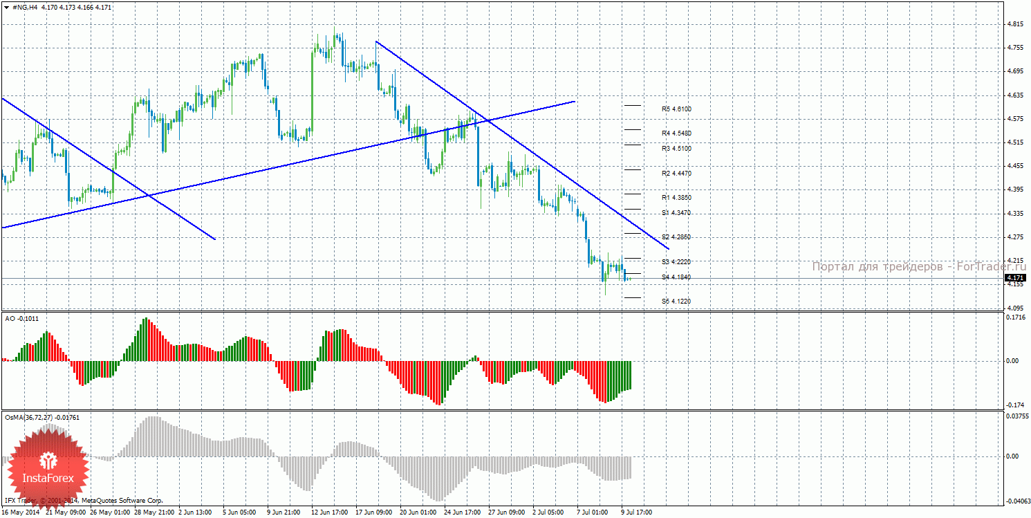 Анализ природного газа за 10 июля показывает, что цена завершила небольшой виток коррекционного движения, не сумев преодолеть уровень S3. На данный момент актуально нисходящее движение с целью уровень поддержки S5 – 4,1220, если цена останется ниже уровня 4,1840. Целями для начала нового витка восходящей коррекции выступают уровни 4,2220 и 4,2850, если цена закрепится выше уровня 4,1840. Построена новая нисходящая линия тренда, которая оказывает поддержку торгующим на понижение и делает актуальными ордера на продажу. Индикатор Awesome показывает локальное восходящее движение, последний закрытый бар окрашен в зеленый цвет. OsMA также направлен наверх, что сигнализирует о восходящем движении цены на газ и в более долгосрочной перспективе. Оба индикатора сейчас разряжаются. Отскок цены от уровня 4,1220 может спровоцировать начало коррекции.