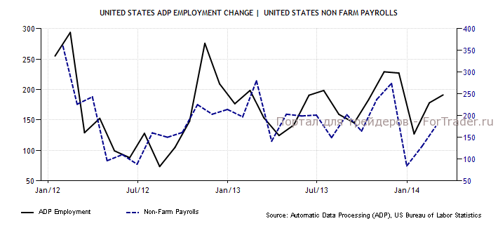 Согласно данным компании Automatic Data Processing (ADP), число новых рабочих мест в частном секторе США в марте выросло на 191 тыс., что почти совпало с прогнозом 195 тыс. Данные за предыдущий месяц были пересмотрены с существенным повышением — со 139 тыс. до 178 тыс. Хотя отчет оказался немного слабее прогнозов, но усилил уверенность в том, что крупнейшая в мире экономика укрепляется после слабых данных начала года. В пятницу министерство труда США представит ежемесячный доклад о занятости и уровне безработицы. Как ожидается, число новых рабочих мест в марте выросло на 195 тыс., а безработица снизилась до 6,6%, с 6,7%.