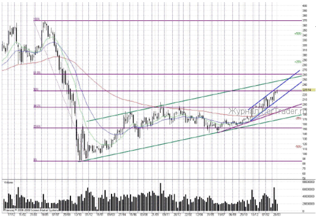 Если по вашей стратегии приемлемо соотношение риска и возможной доходности, то можно осуществить «лонг» с целью 232-232,5 рубля (линия сопротивления декабрьского восходящего канала), и со «стопом» за уровнем 226,7 рубля (линия коррекции Фибоначчи 50% к кризисному падению). Многие трейдеры сейчас говорят о цели 240 рублей. Но у меня нет такой метки на графике. Если рубеж 232,5 будет взят, и дальше движение будет развиваться в темпе последних трех недель, то целью бумаг станет рубеж 250-252 рубля. Если акции замедлят бег и пойдут более обдумано, то они накопят сил и на поход к 260 рублям. Локальные поддержки лучше смотреть на дневном графике – это отторгованные рубежи последних двух недель, незакрытые гэпы, прошлые пики года – 226,7; 225; 220 рублей. Но стоит ли «шортить» от сопротивлений сильные бумаги — решать вам. Лично я буду играть в обе стороны в ближайшие сессии, но не по акциям «Газпрома», а по ближайшему фьючерсу на них.