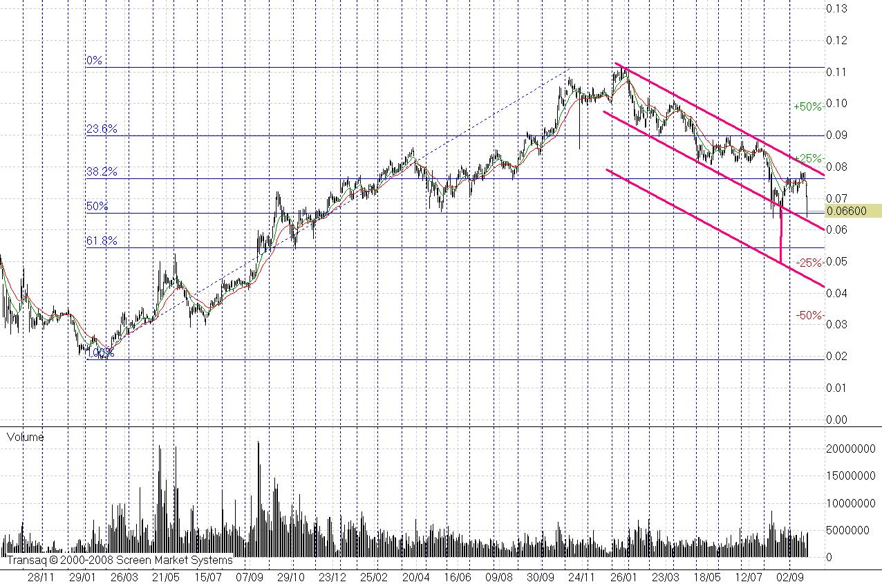 Мощный сплетенный рубеж сопротивления по бумагам 7,8-8 копеек обеспечен пролеганием линии коррекции Фибоначчи 38,2% к росту котировок с мая 2009 года по январь 2011 года и январским нисходящим трендом. Помня, что рынок в целом во власти январских или апрельских трендов (для каждых акций индивидуально), я рекомендую максимум заполнять портфель на половину, если уж в этом есть острая необходимость. Я же надеюсь, что на «ВТБ» ежедневно тренд будет подтягиваться ниже. Но пока, если буду что-то покупать, то даже не по 10, а по 5-8% портфеля.