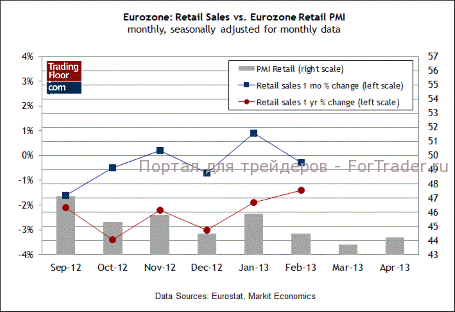 Комментарии в последнем отчете PMI свидетельствуют о том же и формируют ожидания в отношении сегодняшнего релиза. «Резкое падение продаж было зафиксировано во Франции и Италии, в то время как в Германии ситуация остается неизменной», говорится в пресс-релизе Markit Economics за апрель. Никто сегодня не ожидает радикальных изменений в данных Евростата преимущественно потому, что ключевые данные по расходам в отдельных странах к настоящему моменту уже известны. По данным Федеральной статистической службы Германии, результаты розничных продаж за март оказались на удивление низкими. Сегодняшние данные предоставят новый контекст для оценки общего тренда в еврозоне. Но учитывая то, что мы уже знаем о мартовской статистике, новости вряд ли будут воодушевляющими.