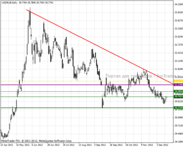 На дневном ценовом графике видим, что есть вероятность сильной коррекции к 31.2616 пунктов, однако в дальнейшем ожидаем продолжение нисходящей тенденции к нижней границе в отметке 30.37 пунктов. В среднесрочной перспективе, в случае отсутствия глубокой коррекции, произойдет отскок от нижней границы фигуры и разворот тенденции с целью 32.56 пунктов.