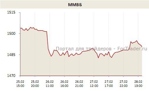 Российский фондовый рынок сегодня все-таки сумел настроиться на отскок после вчерашней заминки, но уверенности инвесторам по-прежнему не хватает. К 14:30 по Москве индекс ММВБ вырос на 0,17% до 1489,65 пунктов, индекс РТС при укреплении рубля прибавил 0,4%, составляя 1536,7 пунктов. В лидерах на московской бирже сегодня – «ВТБ» (+1,9%), перевод его акций в котировальный список «А1» перед столь желанными «пенсионными деньгами» подогрел спрос. Из Катара, между тем, пока не звонят. Также дорожают бумаги «Сбербанка» (+0,85%), «Сургутнефтегаза» (+0,92%), «Ростелекома» (+3,98%), «МТС» (+1,29%), небольшое ралли на удачном отчете за IV квартал и ожидающихся отличных дивидендах устроил «Мегафон» (+3,91%). «Норильский Никель» (-0,2%) и «Уралкалий» (-0,18%) дрейфуют сейчас возле нуля, не нашел в себе силы продолжить подъем «Газпром» (-0,31%), с операциями с которым мы приступаем лишь при выходе из коридора 136,5-138,3 рублей. Компанию ему в «красной зоне» составляют акции «Роснефти» (-0,64%), «ЛУКОЙЛа» (-0,59%) и «Новатэка» (-0,72%)