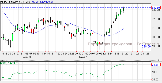 Акции HSBC выросли на 0.06% и закрылись на цене $632.90. Согласно техническому анализу 8-часового графика, акции торгуются с восходящим импульсом и поддерживаются 20-дневной скользящей средней и индикатором относительной силы. Пока акции удерживают этот импульс, возможен рост к отметке $660, однако разворот тренда может стать причиной снижения до уровня поддержки $588.