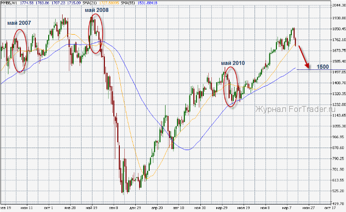 Таким образом, прогноз понижения суверенного рейтинга США и не имеющее пока решения плачевное положение с долгами проблемных стран Еврозоны вместе с приближением окончания второго раунда количественного смягчения могут «увести» в мае рынки в сильный минус. В этом году наша рекомендация на конец весны краткая и укладывается в известную поговорку воротил финансового рынка, находящую подтверждение из года в год – «sell in May and go away» (продай май и иди гуляй).