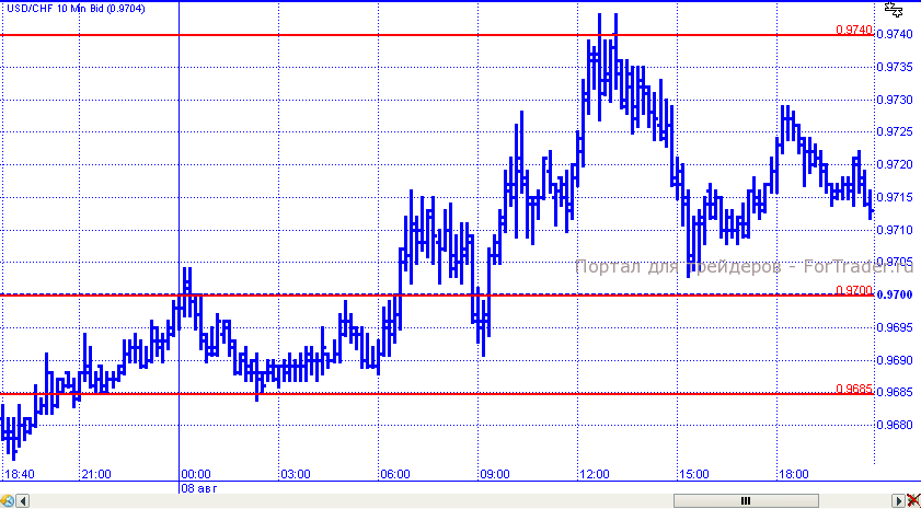 От уровня 0,9685 пара доллар/франк начала рост. Цены преодолели сопротивление 0,9700 и продолжили подъем, в рамках которого попытались преодолеть сопротивление 0,9740, но выше уровня 0,9743 подняться так и не смогли. В результате к завершению торговых суток пара откатилась к уровню 0,9715.