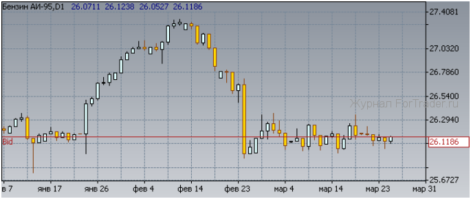 С начала 2011 года цены на бензин продемонстрировали значительный рост. По данным торгово-информационной платформы ITrader 8, исторический максимум за 1 литр бензина АИ-95 был достигнут в середине февраля и составил 27,33 рубля. После этого котировки вернулись в боковой коридор 25,95 — 26,35, в котором и остаются на протяжение последних четырех недель.