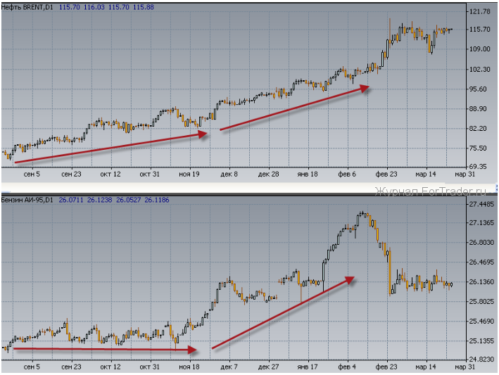 Динамика, наблюдаемая в ценах на бензин с начала года, объясняется временным лагом между данным инструментом и котировками нефти, в силу специфики внутреннего ценообразования российского топлива. Так, если цены на чёрное золото в осенние месяцы 2010 года выросли на 10%, то изменений в стоимости бензина мы не наблюдали. В тоже время, за зимний период рост стоимости нефти продолжился, и одновременно с этим бензин подорожал на 6%.