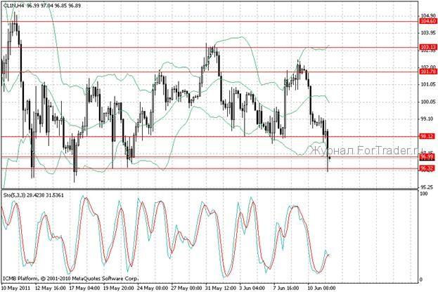 Нефть, как и другие сырьевые активы, теряют популярность. Сырая нефть снижается к отметке 96 долл. за баррель, где находится уровень поддержки мая месяца. В целом, инвесторы готовы и далее играть на понижение сырья, а поэтому сейчас серьезные перспективы восстановления к отметке 100 долл. игроками всерьез не рассматриваются. Тем не менее, часть участников торгов будут пробовать покупки от района 96 с целью 98 долл.