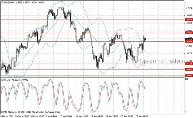 В преддверии голосования по ситуации в Греции валютная пара находит силы, чтобы удерживаться выше отметки 1,4300. Покупателей по паре довольно немного, так как на рынке ощущается возможность серьезного колебания котировок, кроме того, серьезно ухудшилась ликвидность по инструменту. Сейчас цена зажата между скользящими в 100 и 55 дней, поэтому предпосылок для роста выше 1,4400 очень мало. Можно ожидать снижения ниже 1,4364.