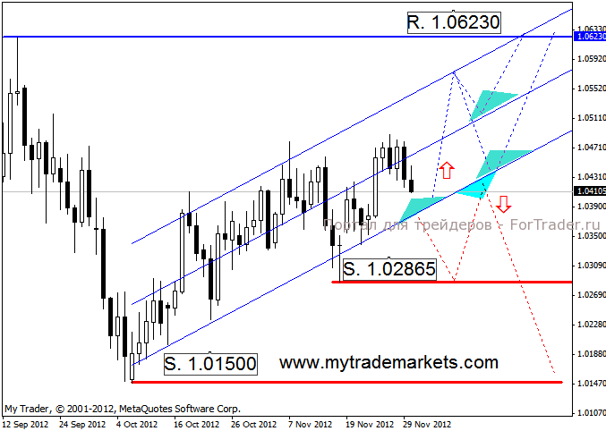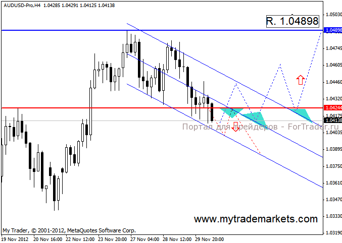 Подытожим: цена снижается, и пока что, это движение напоминает коррекцию, но о ее окончании можно будет говорить только после необходимого восстановления ( пробой канала), пока этого не произошло, актуальны сделки на продажу. Ориентиром для продаж может служить нижняя граница канала. Для покупок- это последний максимум 1.04898.