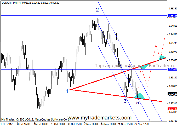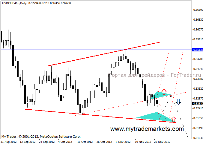 На дневном графике возможно форимрование сразу двух моделей. Если цена с текущих уровней начнет восстановление, то есть не будет пробита пунктирная линия канала- перед нами модель разворота тренда 5:0, и ближайшая цель-это последний максимум 0.95129.