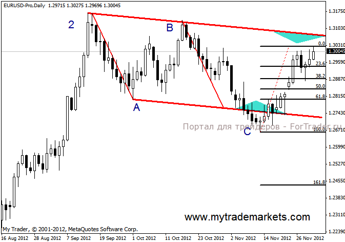 На дневном графике все идет по сценарию- цена приближается к верхней границе канала. Напомню, следим за формированием коррекционной модели АВС.