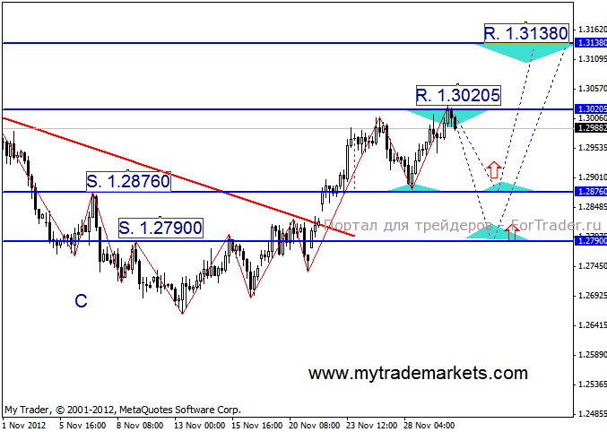В данный момент цена застряла возле уровня сопротивления 1.30205. Предполагаю, будет повторное тестирование поддержки на 1.28760, что сформирует горизонтальный канал, границы которого дадут неплохие возможности для открытия позиций. Но не исключаю и вероятности тестирования более низкого уровня 1.27900 и соответственно, формирование модели Двойная вершина.