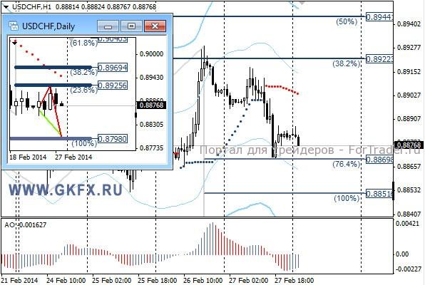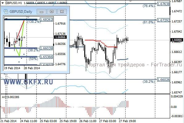 Пара EURUSD продолжила торговаться с понижением на европейских торгах. Однако на американских торгах все поменялось. Очередная серия слабых данных по США и выступление главы ФРС Йеллен, заставили доллар потесниться. Основной рост пары случился во время выступления Йеллен, когда она выразила сомнение, что череда слабых данных по США обусловлена холодной зимой. Рынок незамедлительно отреагировал. По рекомендации сделка исполнилась, и первая цель была достигнута на выступлении Йеллен. На эту неделю традиционно рассматриваю два варианта возможного движения цены, основной красный и альтернативный зеленый. Значимые уровни на сегодня отмечены на часовом графике. Индикатор АО находится в положительной зоне и снижается, указывая на коррекцию перед возможным продолжением роста. Индикатор тренда указывает на рост. Держим покупки от 1,3700 с целью 1,3770.