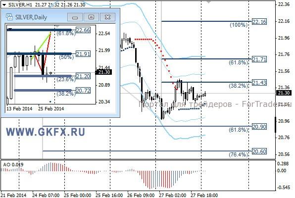 Цены на серебро после вчерашнего утреннего резкого снижения корректировались в течение дня, и даже выступление главы ФРС Йеллен значительно не повлияло на серебро. Тем не менее, сценарий для роста цен исполняется, и по серебру даю рекомендацию для покупок. Традиционно делаю два варианта движения цены на неделю, основной красный и альтернативный зеленый. Значимые уровни на сегодня отмечены на часовом графике. Индикатор АО находится у нуля, указывая на неопределенность. Индикатор тренда указывает на рост. Преодоление 21,46 позволит войти в покупки с целями 21,65, 21,75 и 22,00.