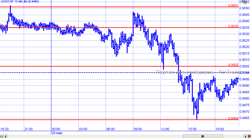 Пара доллар/франк в четверг понесла потери. Довольно быстро цены от максимума на 0,9551 цены закрепились ниже уровня 0,0535. Смогла пара пройти и поддержку 0,95, отметив локальный минимум на уровне 0,9464. Однако, к завершению торговых суток цен откатились снова в район сопротивления 0,95.
