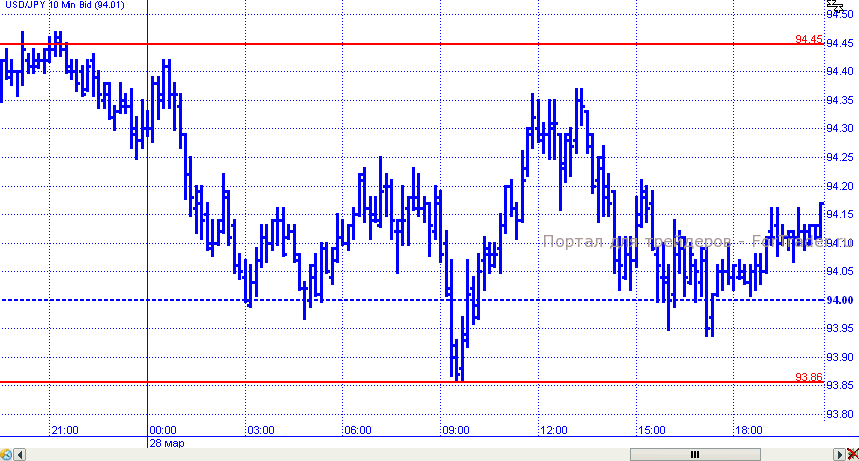Скорее всего, и в пятницу пара доллар/иена будет демонстрировать держанные движения. Вероятно, динамика движения пары будет ограничена диапазоном 93,80 – 94,45.