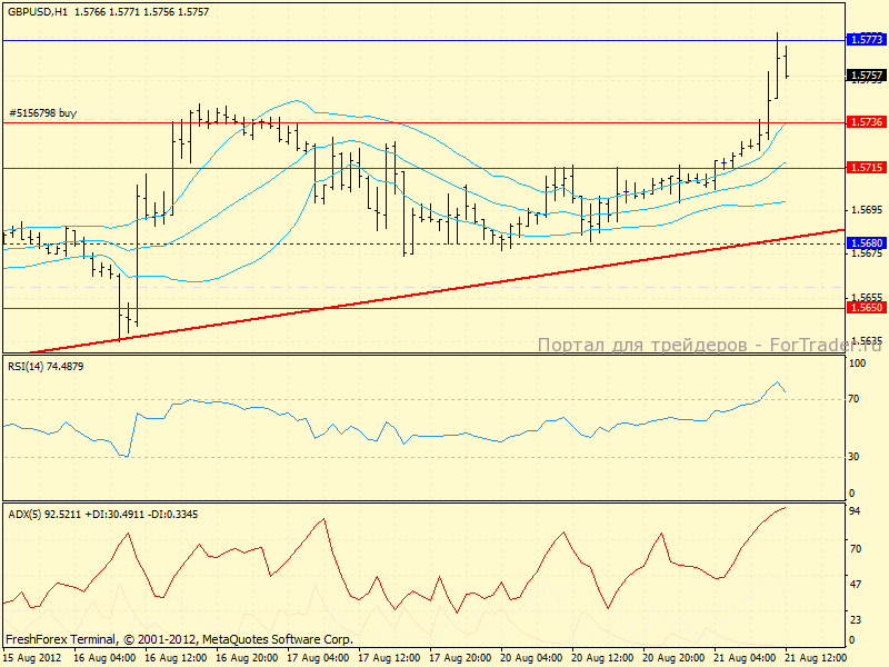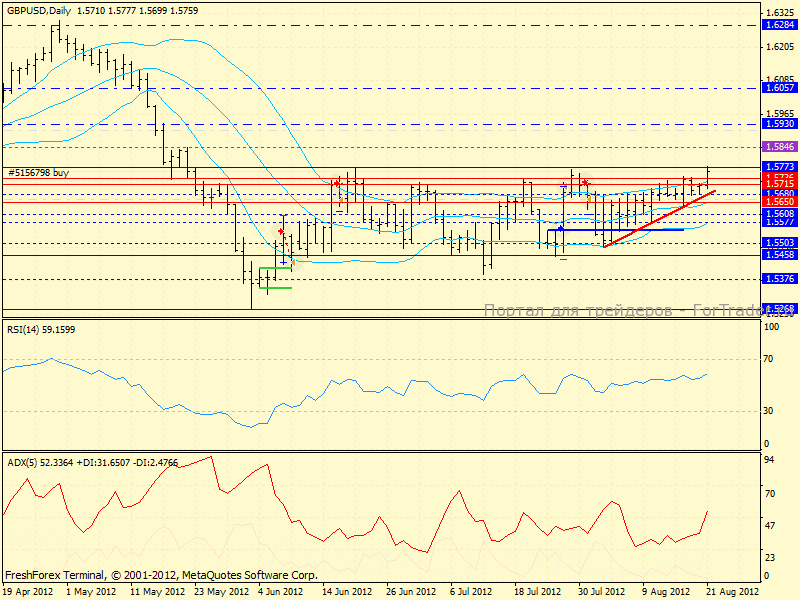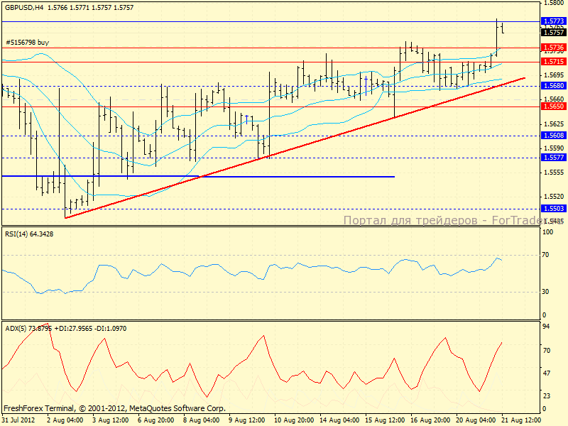 Дневной график: динамичный процесс пробития ИБ, что на фоне рванувшего вверх АДХ и синхронно растущего евро, формирует очень сильную северную карму для британца. На пути одно сильное сопротивление 1.5773 и оно уже тестируется.