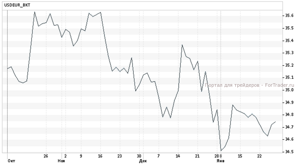 Пока обыватели недоуменно смотрят на курс доллара, профессионалы в первую очередь анализируют график бивалютной корзины к рублю — именно на ее курс ориентируется Центробанк (сейчас он держит уровень в 34,65 рублей за бивалютную корзину), отсекая таким образом междусобойные танцы доллара и евро. А там мы видим пробой уровня в 35,1 рубля, который произошел в конце ноября.