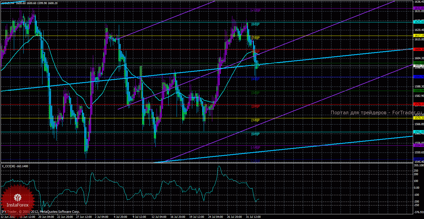 Исходя из картины, сложившейся по золоту 2 августа, видно, что инструмент закрепился ниже мувинга, поэтому никакие позиции сейчас не актуальны из-за направленности каналов наверх. Старший канал развернулся наверх, что свидетельствует о восходящем направлении движения глобального тренда. Младший канал также развернулся наверх, что означает восходящее направление движения. На данный момент цена находится ниже мувинга и ниже уровня Мюррея «5/8»(уровни Мюррея перерисовались), что говорит нам о нисходящем направлении движения в ближайшей перспективе. Первой целью нисходящего движения, таким образом, является уровень Мюррея «4/8» — 1593,75, но отторговывать нисходящее движение сейчас не рекомендуется, так как ни один канал не направлен вниз. В случае преодоления этого уровня Мюррея, следующим таргетом для возможного снижения курса золота будет выступать уровень Мюррея «3/8» — 1585,84. Скользящая средняя направлена вниз, а цена находится ниже нее, поэтому сейчас более вероятно нисходящее движение в ближайшие дни. Хайкен Аши окрасил последние бары в голубой цвет, что сигнализирует о текущем нисходящем движении, однако, в любом положении индикатора шорты сейчас не актуальны. Короткие позиции станут вновь актуальными после разворота одного из каналов линейной регрессии вниз. Лонги можно будет рассматривать после обратного закрепления цены выше скользящей средней. Индикатор CCI находится около уровня -200, что говорит о сильной перепроданности инструмента, что может привести к отскоку цены наверх.