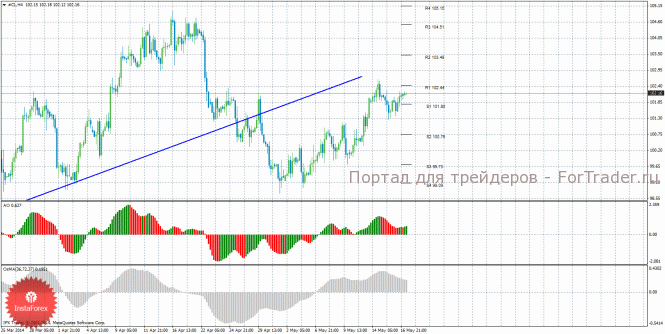 Анализ сырой нефти за 19 мая показывает, что цена возобновила коррекционное движение, но в начале новой недели располагается между уровней S1 и R1. Нисходящее движение может возобновиться с целями S2 – 100,76 и S3 – 99,73, если цена закрепится ниже уровня 101,80. Может продолжиться восходящая коррекция с целями уровни 103,48 и 104,51, если цена закрепится выше уровня 102,44. Цена закрепилась ниже восходящей линии, поэтому она более не актуальна. Нисходящей линии тренда на данный момент нет. Индикатор Awesome показывает текущее восходящее движение, так как последний закрытый бар зеленого цвета. OsMA же направлен вниз, что говорит о нисходящем характере движения и в более долгосрочном плане. Отскок цены от уровня 102,44 может спровоцировать возобновление нисходящего движения.