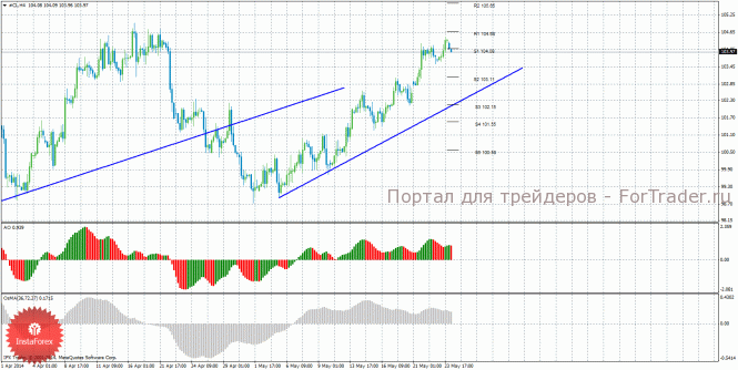 Анализ сырой нефти за 26 мая показывает, что цена продолжает восходящее движение, но может начать виток коррекционного движения. Восходящее движение может продолжиться с целями R1 – 104,68 и R2 – 105,65, если цена отскочит от уровня 104,08. Может начаться нисходящая коррекция с целями уровни 103,11 и 102,15, если цена закрепится ниже уровня 104,08. Сформировалась восходящая линия тренда, которая поддерживает торгующих на повышение и делает актуальным восходящее движение. Индикатор Awesome показывает текущее восходящее движение, так как последний закрытый бар зеленого цвета. OsMA направлен вниз, что говорит о нисходящем характере движения в более долгосрочном плане. Отскок цены от уровня 104,08 может спровоцировать продолжение восходящего тренда.