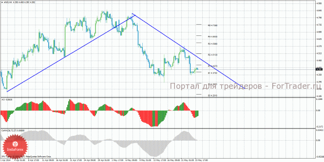 Анализ природного газа за 26 мая показывает, что цена находится в начале новой недели между уровнями S1 и R1 и не определилась еще с направлением движения. На данный момент актуально нисходящее движение с целями уровни поддержки S2 – 4,2870 и S3 – 4,2010, если цена закрепится ниже уровня 4,3730. Целью для восходящей коррекции выступает линия тренда, если цена остается выше уровня 4,3730. Построена нисходящая линия тренда, которая поддерживает торгующих на понижение. Индикатор Awesome показывает локальное восходящее движение, последний закрытый бар окрашен в зеленый цвет. OsMA направлен вниз, что сигнализирует о нисходящем движении цены на газ в более долгосрочной перспективе. Отскок цены от линии тренда может спровоцировать возобновление нисходящего движения.