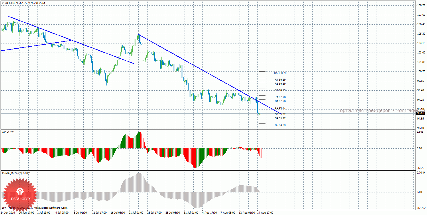 Анализ сырой нефти за 15 августа показывает, что цена закрепилась ниже уровня поддержки 95,67, также перестроена нисходящая линия тренда. Нисходящее движение может продолжиться с целями уровни поддержки S4 – 95,17 и S5 – 94,36, если цена останется ниже уровня 95,67. Целями для восходящей коррекции выступают уровни поддержки 96,47 и 97,28, если цена закрепится выше уровня 95,67. Нисходящая линия тренда перестроена и вновь оказывает поддержку торгующим на понижение и делает актуальным нисходящее движение. Индикатор Awesome показывает текущее нисходящее движение, так как последний закрытый бар красного цвета. OsMA также направлен вниз, что говорит о нисходящем характере движения и в более долгосрочном плане. Отскок цены от уровня 95,17 может спровоцировать начало коррекционного движения.
